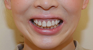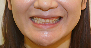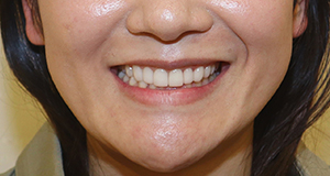 歯肉整形と削らないラミネートベニアで歯並び・歯の大きさを改善した症例です。 歯肉整形と削らないラミネートベニアを行い、曲がっていた歯列が左右対称に見えるように改善しました。