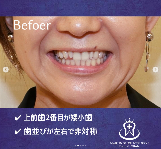 Before写真では、側切歯が小さいことで歯並びが左右非対称なのがよくわかります。また、正中も少しずれていますね。