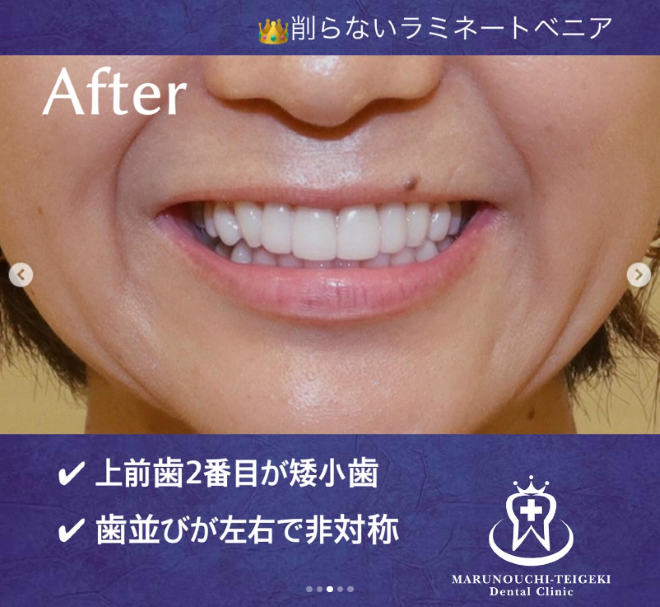 ラミネートベニア後のAfter写真を見ると、隣り合った歯同士の色合いに違和感がなく、正中も揃ったことで、左右のバランスがきれいに整いました。
