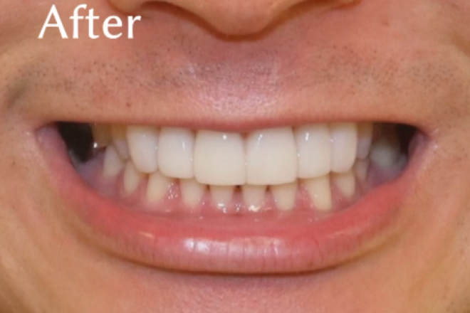 Afterの写真では、違和感なく上前歯が整ったことがよくわかります。歯の形や大きさ、歯並びのバランスを修正しながら、約2ヶ月かけてきれいになりました。